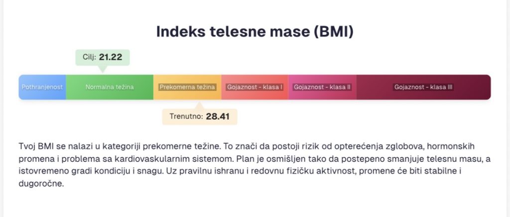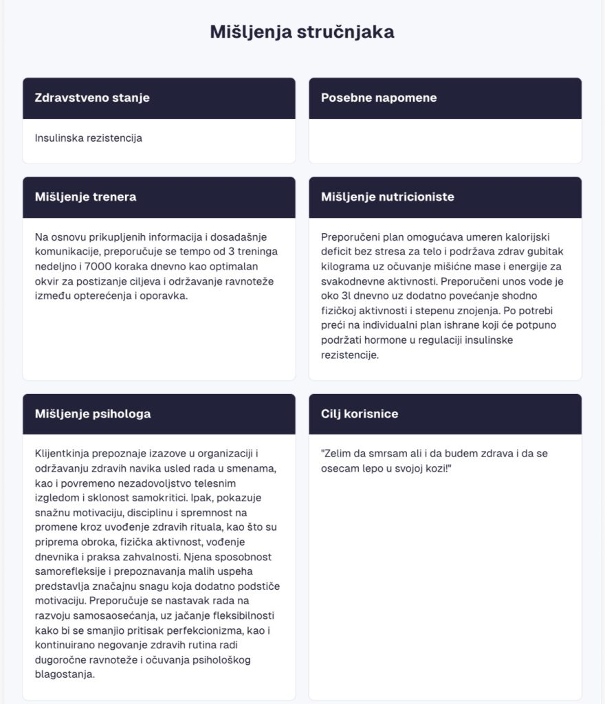 On prikazuje tvoje mere, BMI indeks, ciljeve i mišljenje stručnog tima – sve što ti je potrebno za praćenje napretka na jednom mestu.