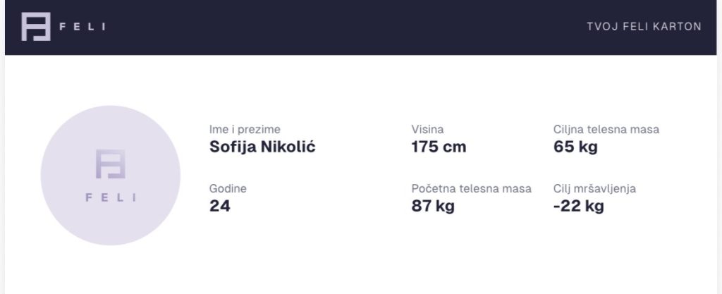 Feli karton je tvoj personalizovani profil unutar Feli aplikacije, kreiran da ti pruži jasnu sliku trenutnog stanja i put ka cilju.