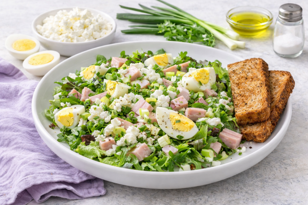 Jaja skuvaj u posoljenoj vodi. Povrće za salatu operi i iseckaj zajedno sa mladim lukom. Prelij maslinovim uljem i jabukovim sirćetom. Dodaj ćureću šunku, kuvana jaja i cottage sir, pa sve lagano promešaj. Posluži uz integralni hleb.